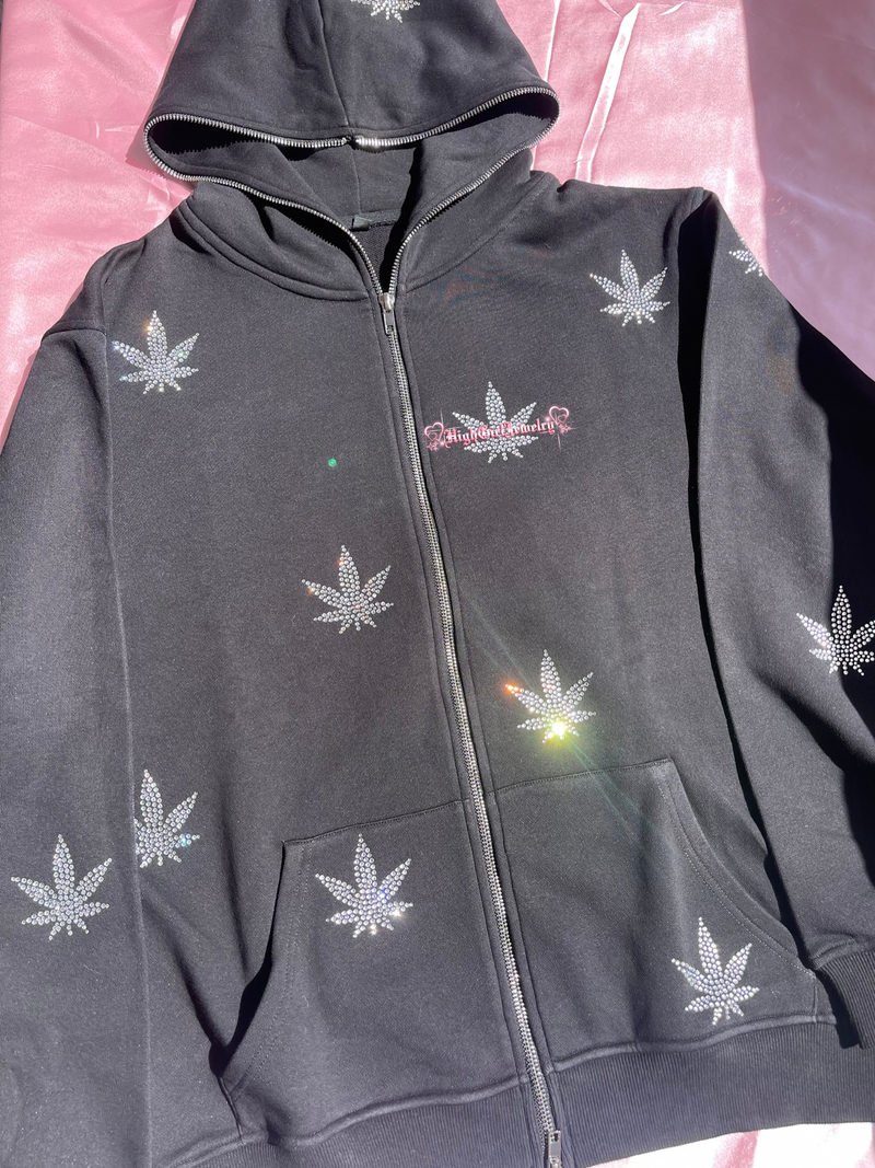 Black Weed Rhinestone Zip Up Hoodie♡