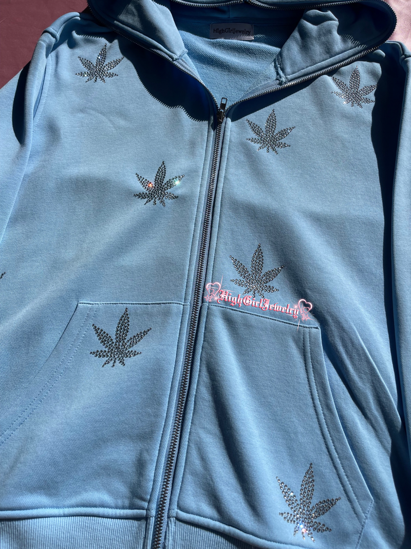 Baby Blue Weed Rhinestone Zip Up Hoodie♡