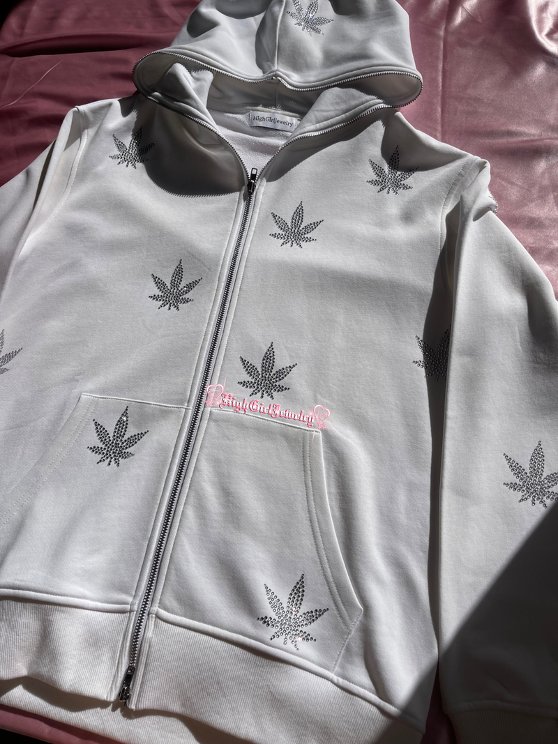 White Weed Rhinestone Zip Up Hoodie♡