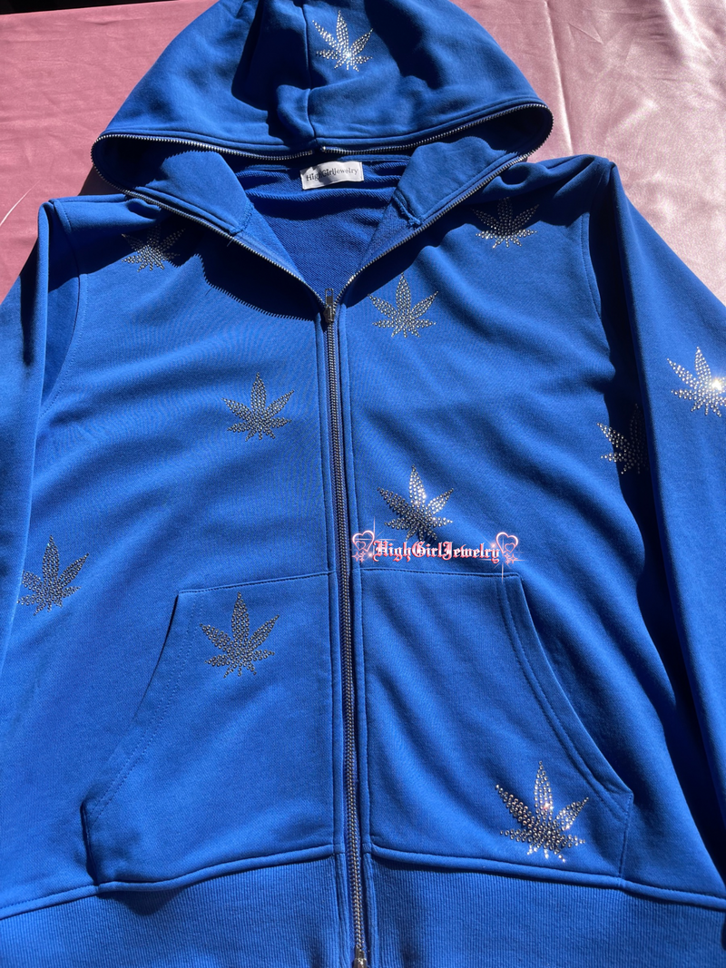 Royal Blue Weed Rhinestone Zip Up Hoodie♡