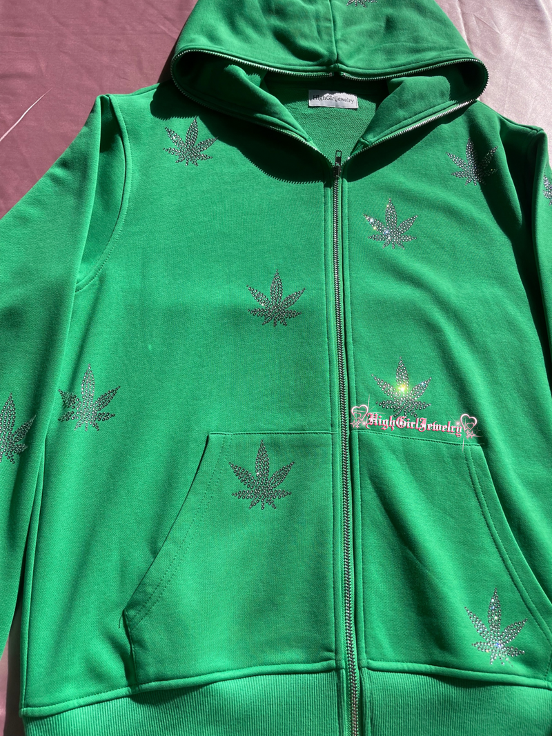 Green Weed Rhinestone Zip Up Hoodie♡